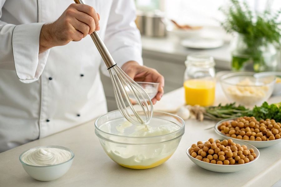 Wegańskie sosy i dressingi na bazie aquafaby zachwycają kremową konsystencją. Majonez z aquafaby (60 ml) z dodatkiem 1 łyżeczki musztardy, 200 ml oleju i przypraw dorównuje tradycyjnemu, oferując identyczną teksturę i możliwość łączenia smaków. Aioli, remoulade czy sos tatarski przygotowane na bazie aquafaby stanowią doskonałą alternatywę dla wersji z jajkami.