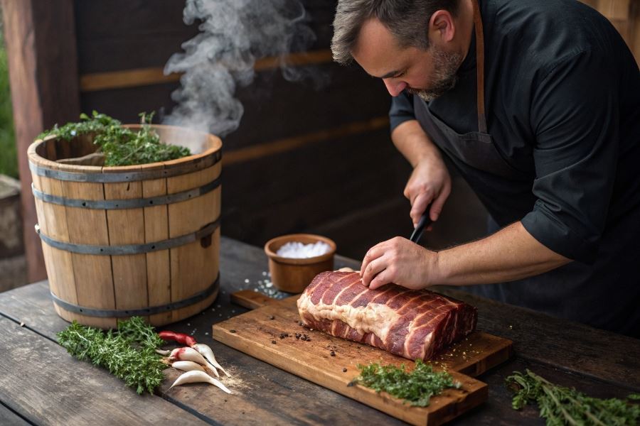 Po okresie peklowania opłucz mięso pod zimną wodą, osusz ręcznikiem papierowym i przystąp do formowania. Zroluj mięso ciasno, formując walec, a następnie obwiąż go sznurkiem kuchennym, tworząc charakterystyczną siatkę. Zacznij od środka i przesuwaj się ku końcom, zachowując równomierne odstępy około 1,5 cm.