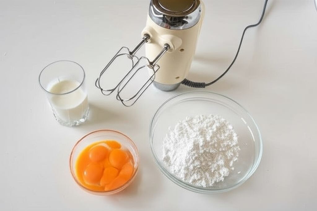 Żółtka ucieramy z cukrem pudrem przez 5 minut. Na końcu dodajemy śmietanę i krótko mieszamy mikserem.