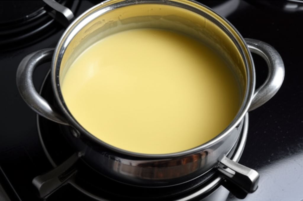 Mieszaninę ogrzewamy na niskim ogniu w rondelku aż do wrzenia. Odstawiamy z ognia i pozostawiamy do ostygnięcia.