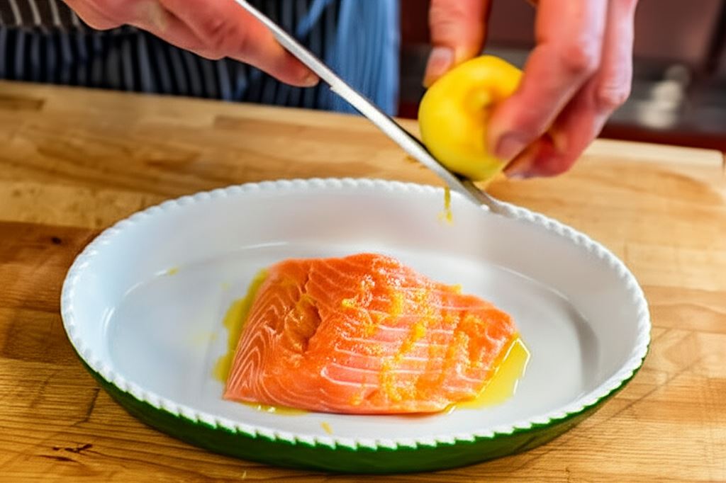 Łososiowy filet osusz ręcznikiem papierowym. Potem skrop oliwą, posyp solą oraz skórką cytrynową.