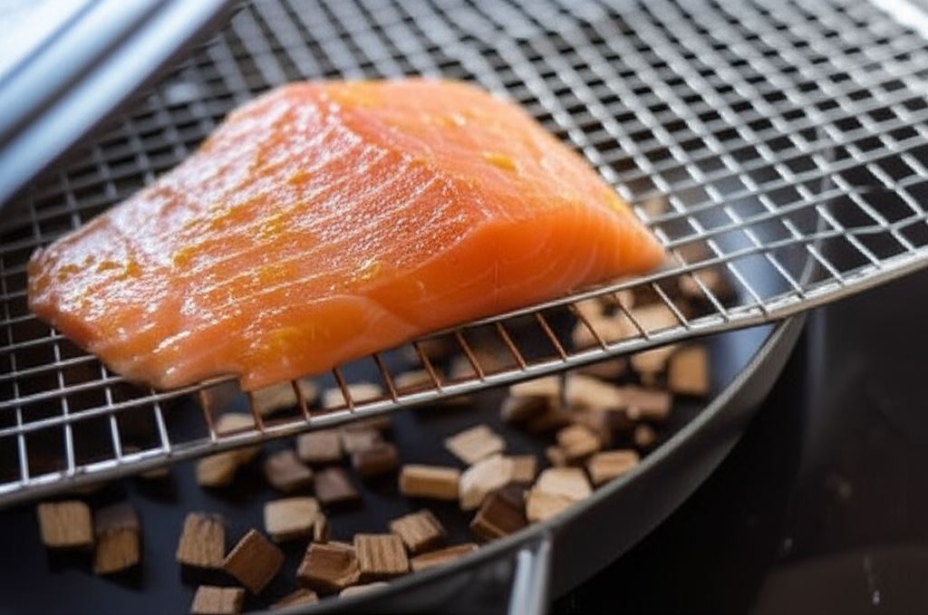 Wysyp drewniane zrębki na suchą patelnię i umieść kratkę. Podgrzewaj patelnię aż zrębki zaczną delikatnie dymić – umieść łososia na kratce, przykryj patelnię i zostaw na 3-4 minuty. Następnie odkryj patelnię i umieść w piekarniku rozgrzanym do 180 st. C na 5 minut. Wystudź rybę po upieczeniu.