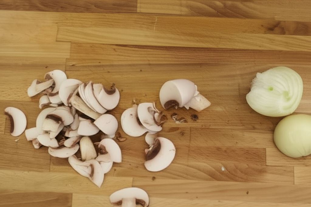 Pieczarki potnij na cienkie plastry, a cebulę drobno posiekaj.
