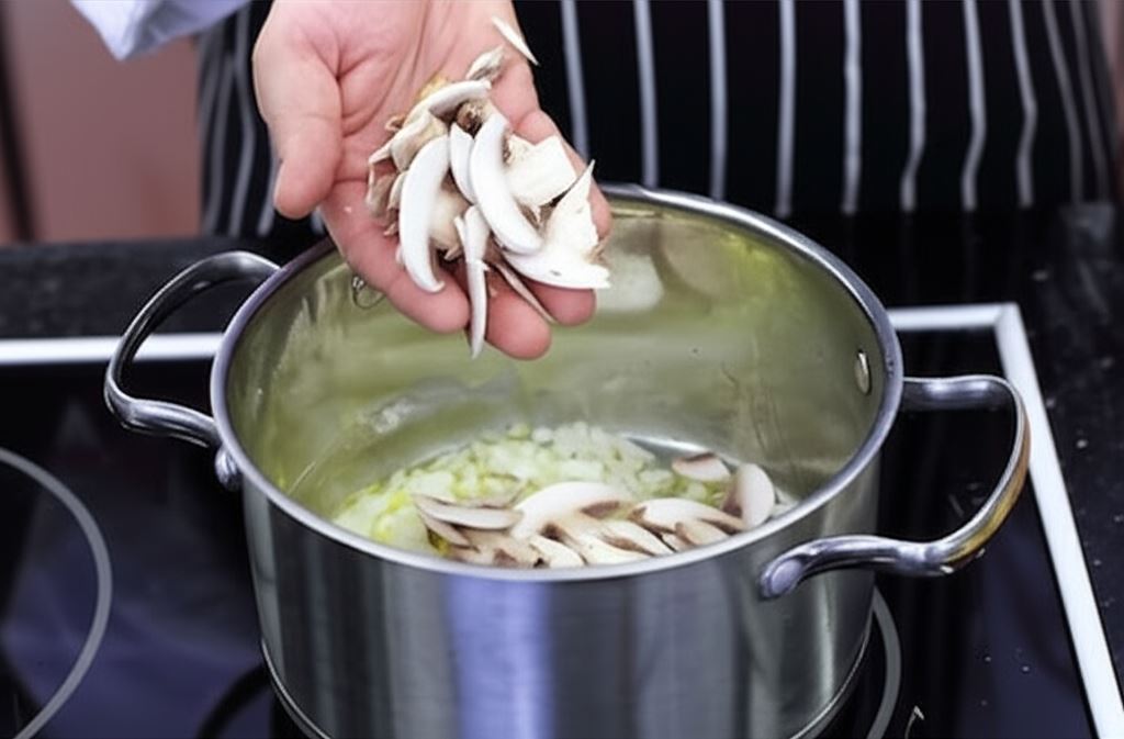 Rozgrzej margarynę w garnku i przez chwilę podsmaż pieczarki z cebulą.