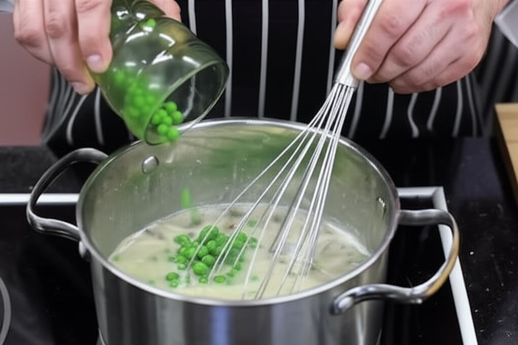 Wsyp do zupy zielony groszek i posiekany szczypiorek. Doprowadź całość do wrzenia i od razu przelej na talerz. Groszek powinien być jędrny i zachować zieloną barwę. Przed serwowaniem posyp zupę kiełkami.