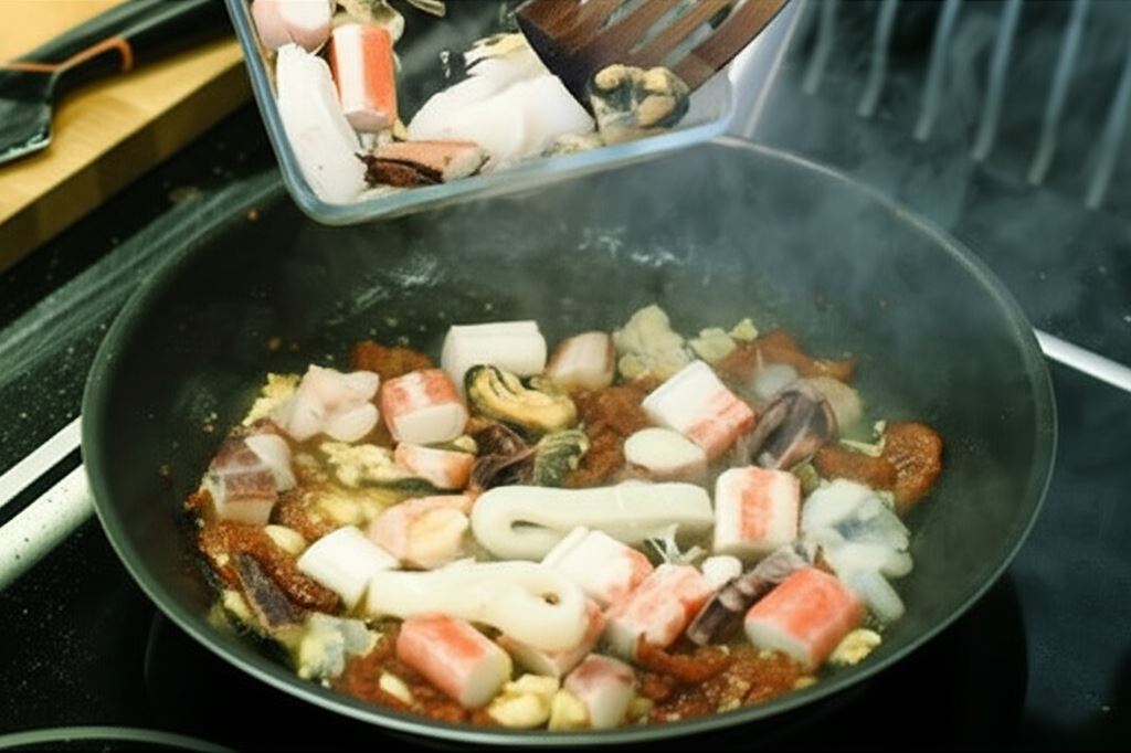 Na rozgrzanej oliwie zrumień czosnek i pomidory, wsyp owoce morza (z wyjątkiem ryb) oraz liście bazylii.