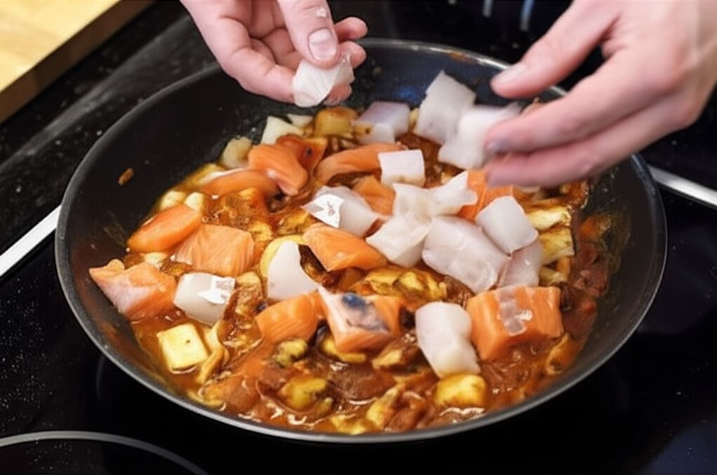 Wlej szklankę wody, wsyp Fix Lasagne Knorr i doprowadź do wrzenia. Ryby potnij w kostkę 2x2 cm i wrzuć do sosu. Wszystko gotuj 2 minuty na wolnym ogniu.