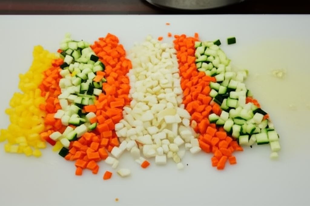 Marchew, seler, cebulę, cukinię, czosnek i oczyszczone papryki pokrój w drobną oraz równomierną kostkę.