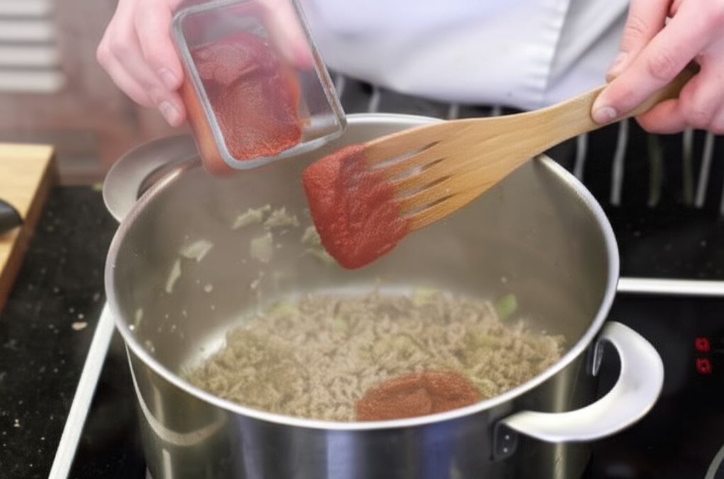 W dużym garnku na oliwie zrumień posiekany czosnek i pokrojoną w kostkę cebulę. Wsyp mielone mięso. Wszystko smaż, aż z mięsa całkowicie wyparują soki. Wsyp koncentrat pomidorowy. Przypraw do smaku solą, pieprzem i szczyptą suszonego oregano.