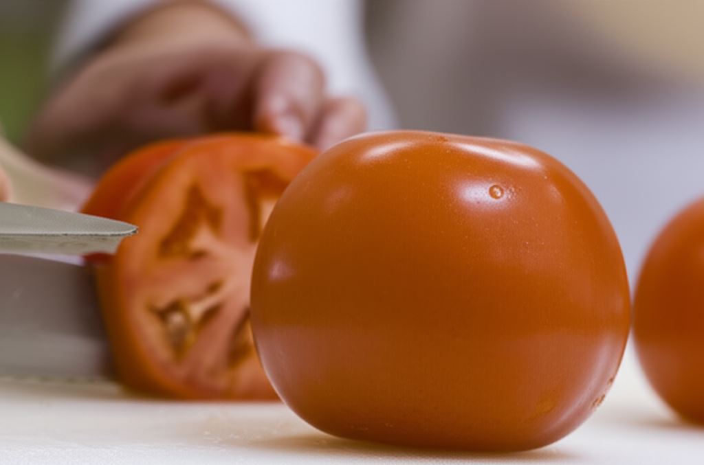 Przygotuj deskę kuchenną. Pomidory opłucz i wysusz, po czym pokrój na plasterki. Oliwki podziel na równe krążki.