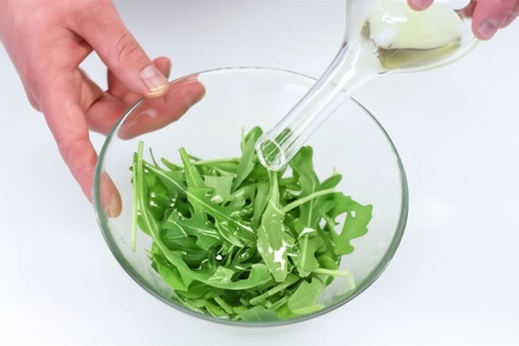 Rukolę połącz z oliwą. Przygotowane panini z szynką i serem przekrój na połowę i serwuj z sałatką.