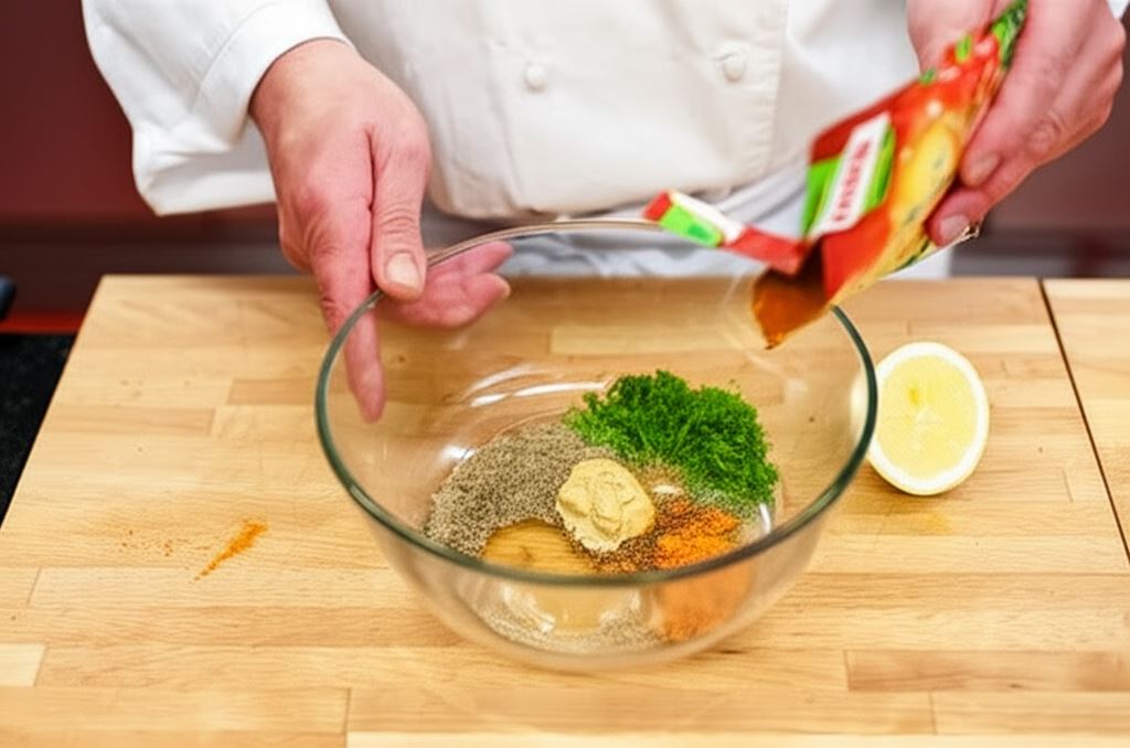 W misce wymieszaj oliwę z oliwek, musztardę, miód, przyprawę do mięsa Knorr, majeranek, tymianek oraz posiekany koperek.