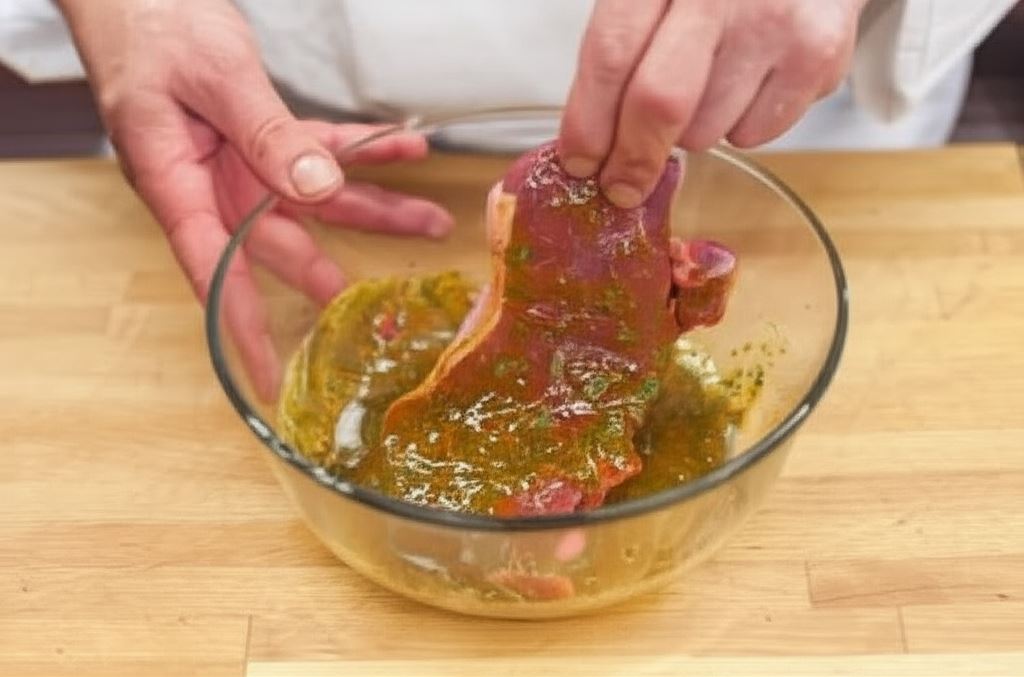 Steki opłucz, osusz, umieść w płaskim naczyniu, pokryj marynatą i odłóż na godzinę do lodówki.