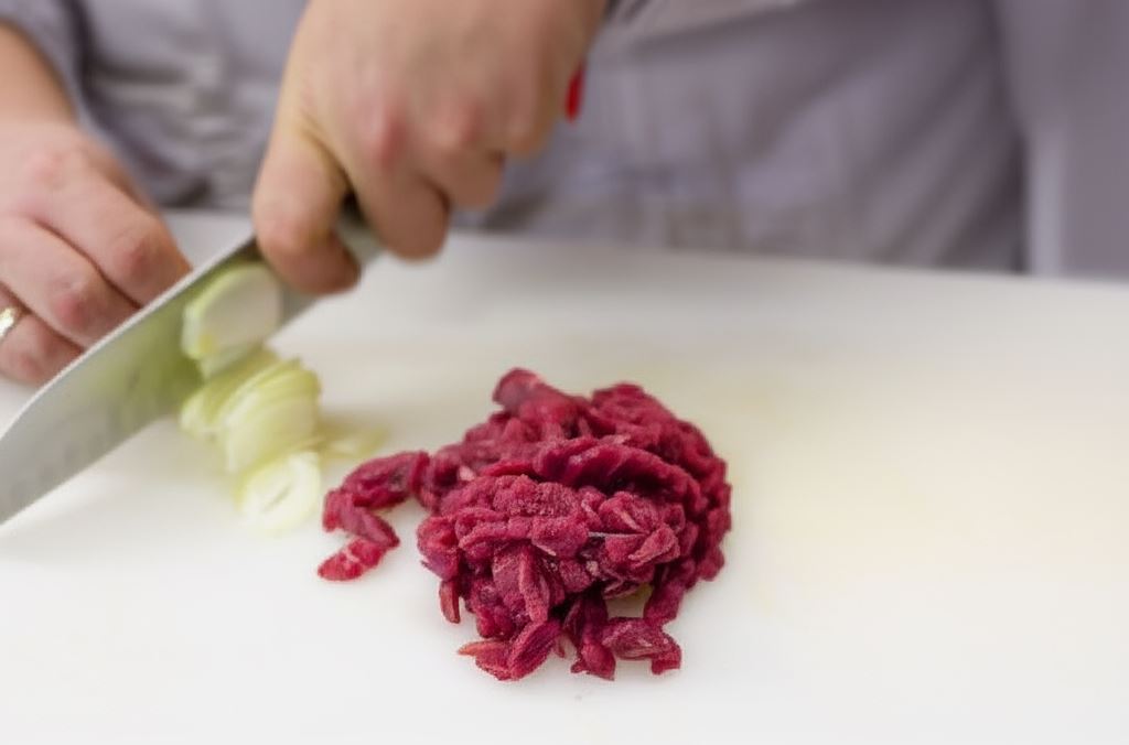 Wołowinę potnij w paski. Dwie cebule posiekaj, a czosnek rozgnieć.