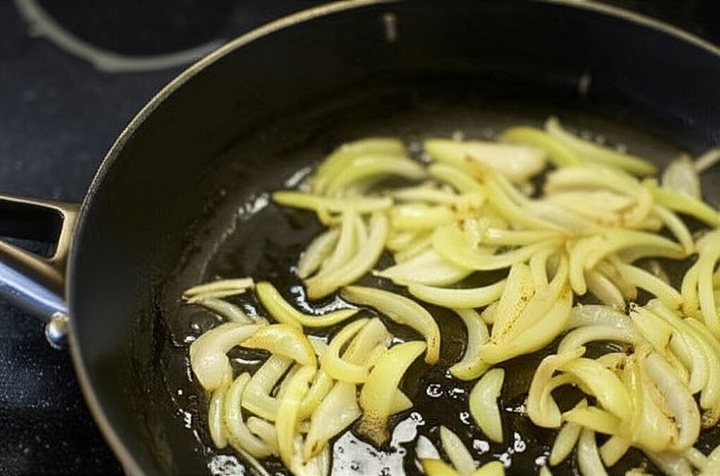 W międzyczasie następne dwie cebule pokrój w paski i zrumień na brązowo. Wołowinę serwuj z ryżem, oprószoną zrumienioną cebulą.