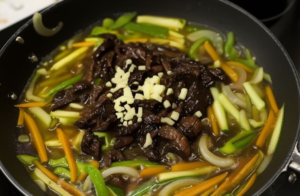 Delikatne paski wołowiny otulone aromatyczną marynatą, chrupiące warzywa i wyrazisty imbir tworzą kompozycję, która przeniesie Cię w kulinarną podróż po Dalekim Wschodzie. To danie, w którym każdy kęs to harmonia smaków – słodycz marchwi, delikatność cukinii i pikantność imbiru idealnie równoważą się z soczystą wołowiną.