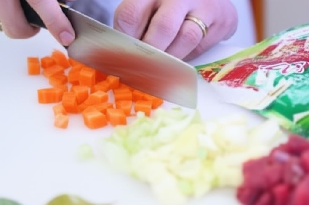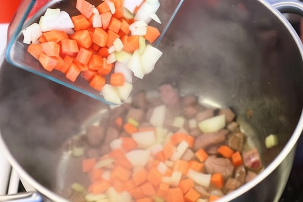 Mięso potnij w kostkę o wymiarze 2 centymetrów. Tak samo pokrój marchew, selera i cebulę.