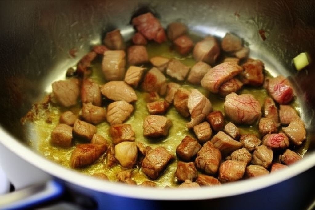 W sporym garnku podgrzej oliwę i obsmaż mięso.