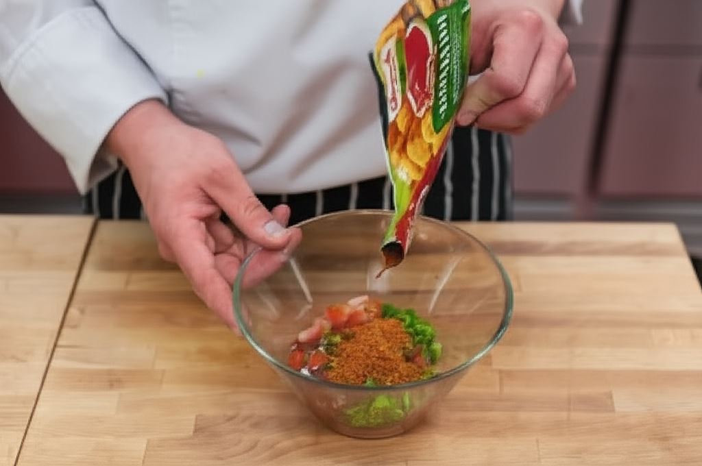 Pomidora posiekaj w małą kostkę. Szczypior drobno pokrój. Pomidory oraz szczypior wymieszaj z sosem meksykańskim i Ketchupem Hellmann's Łagodnym.
