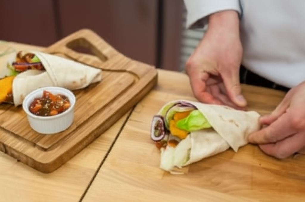 Kawałki kurczaka, liść sałaty, plastry czerwonej cebuli i łyżkę salsy pomidorowej owiń w tortillę. Doskonałym dodatkiem do wrapa będzie natka kolendry, a do salsy – łyżeczka oliwy z oliwek.