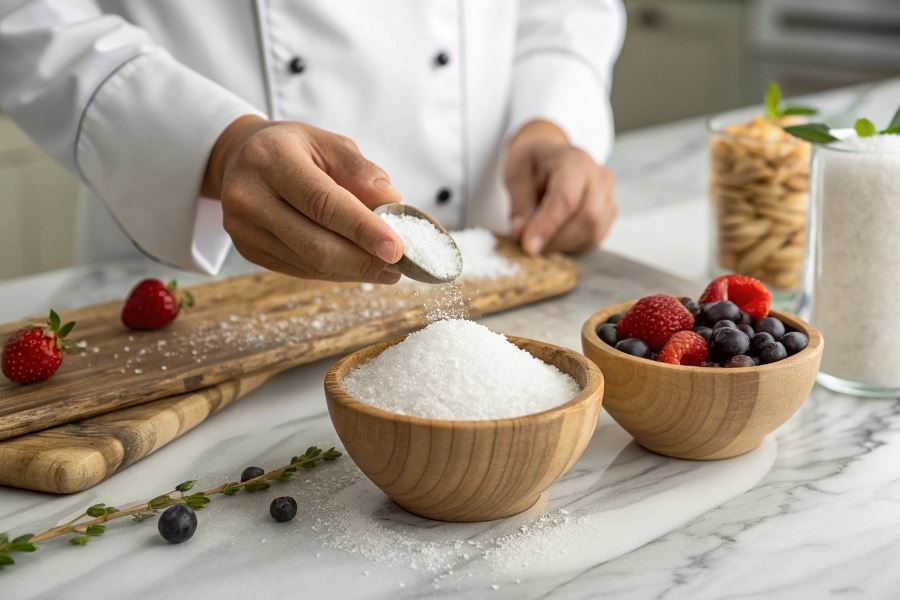 • Intensywnie słodkim smakiem, porównywalnym do sacharozy (słodkość na poziomie 95-100% słodkości cukru)