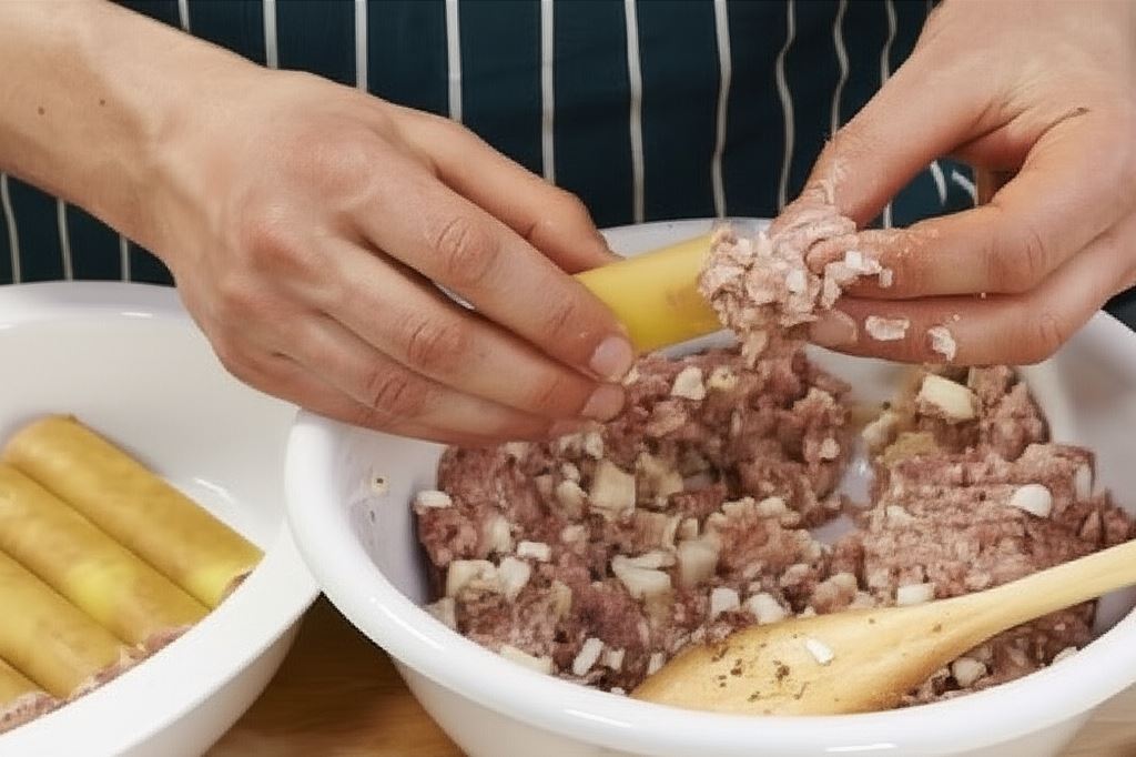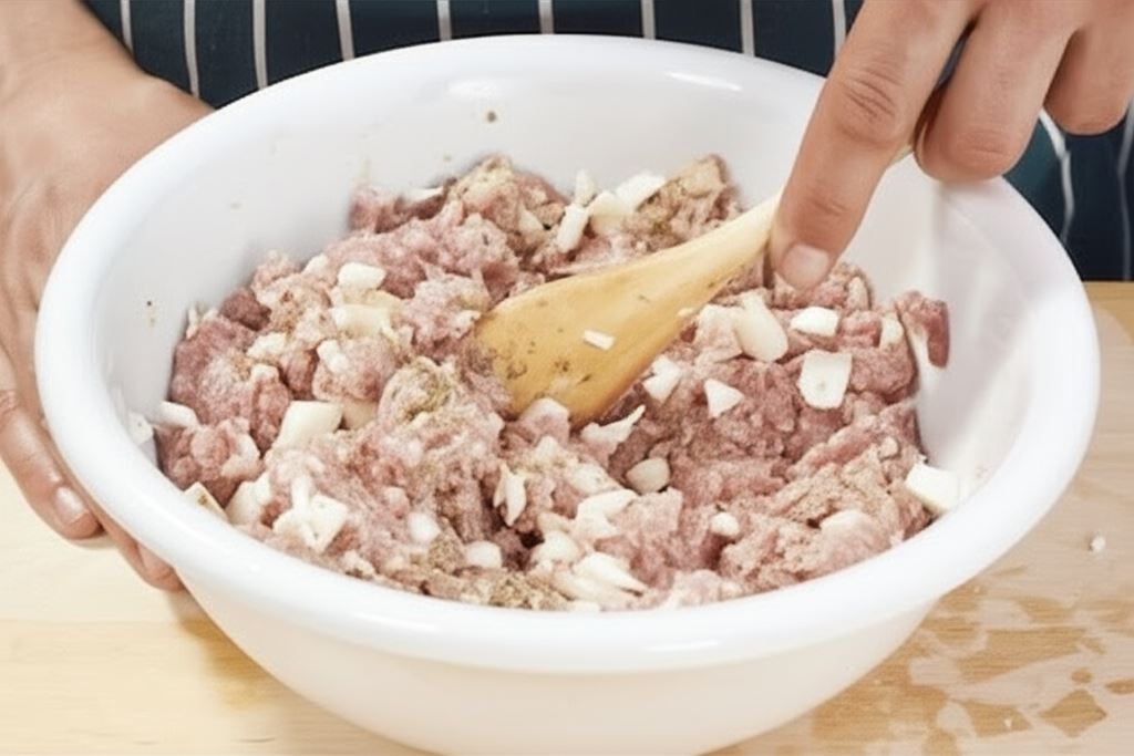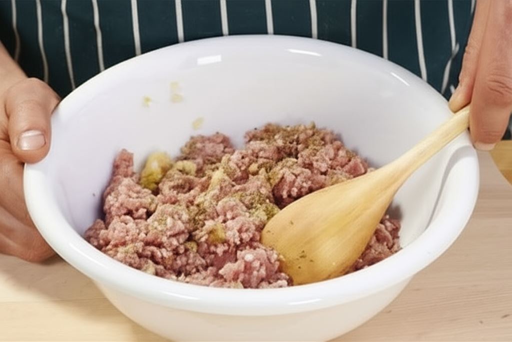 W obszernej misce połącz mięso mielone z przyprawami, przeciśniętym przez praskę czosnkiem i dwoma łyżkami wody.