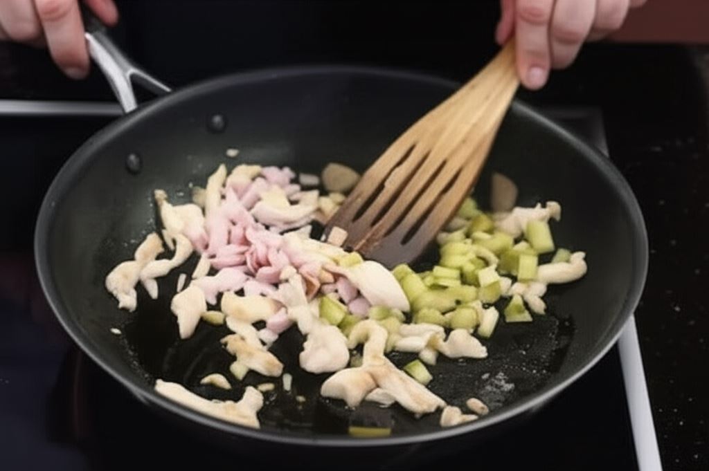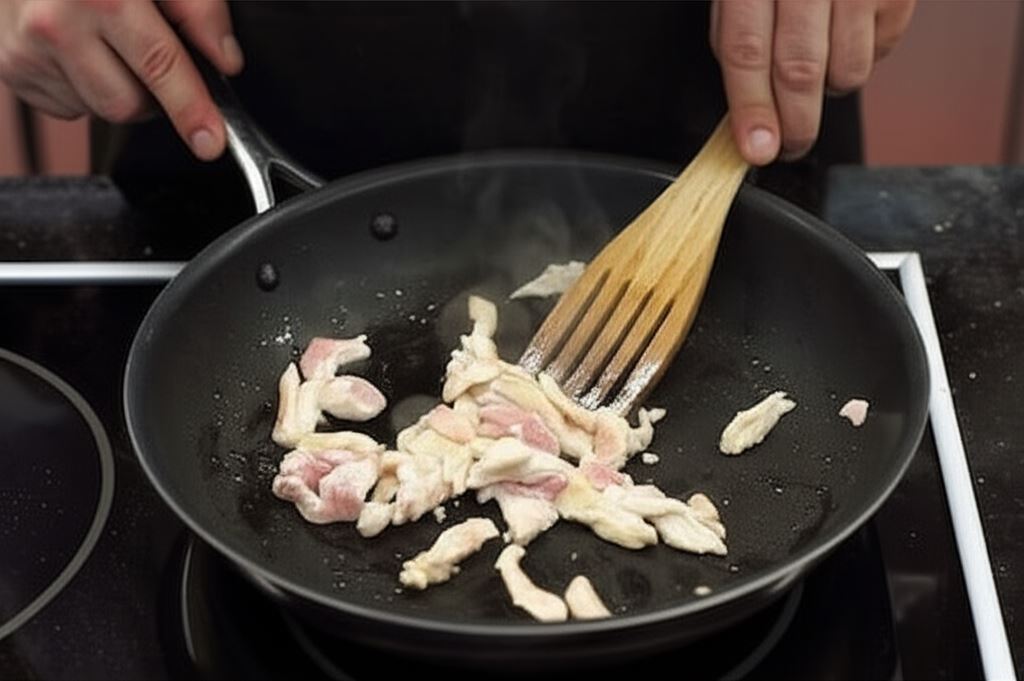 Rozgrzej olej na patelni i zrumień pokrojoną w paski pierś kurczaka.