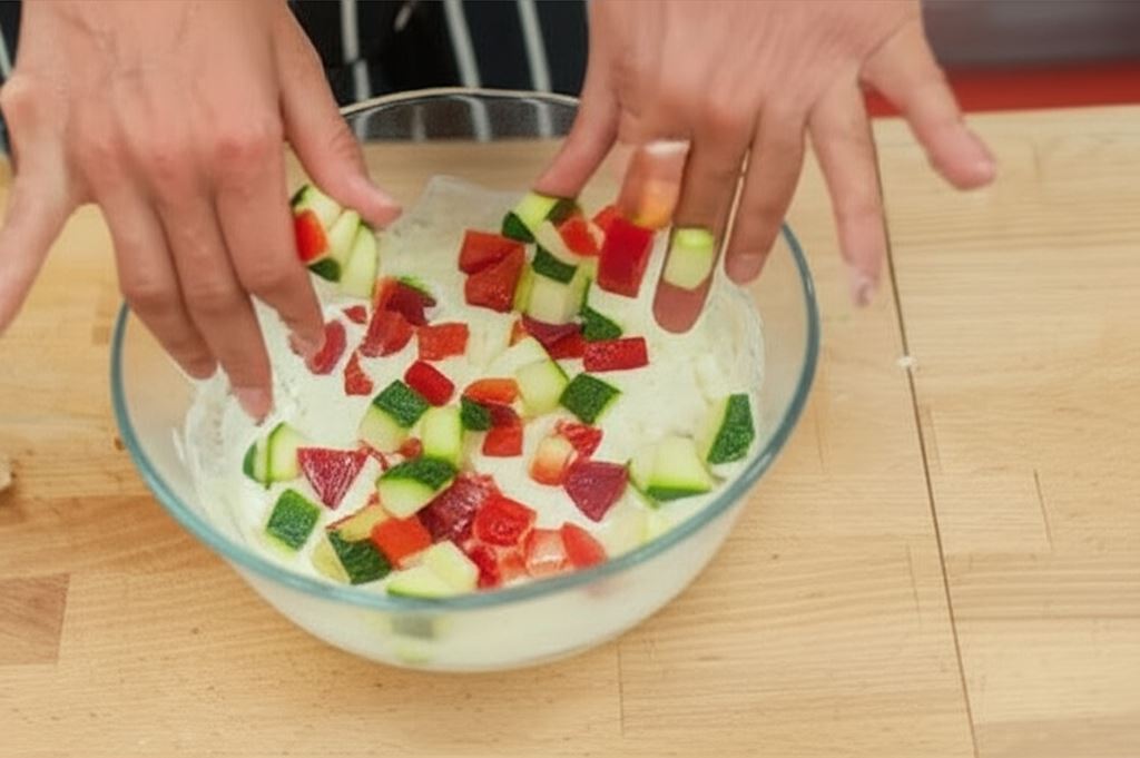 Cukinię i paprykę pokrój na duże kostki i wymieszaj z sosem.