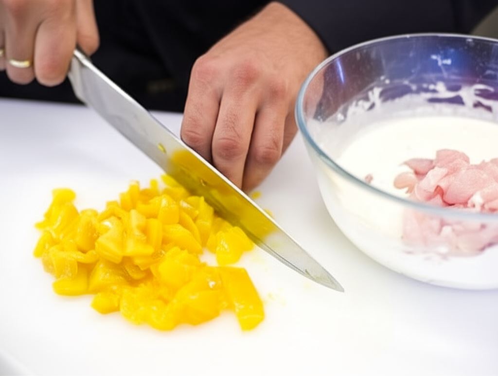 Kurczaka pierś i brzoskwinie potnij w paski, połącz z pozostałym sosem. Potem ułóż na ziemniakach.