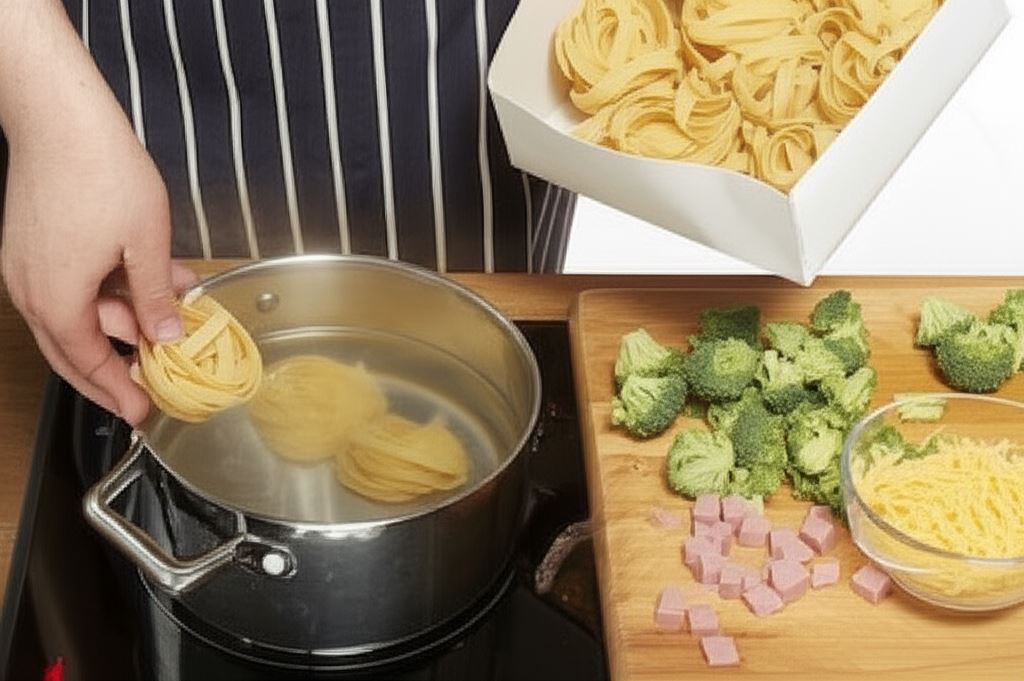 Nagrzej piekarnik do 200°C. Przygotuj makaron według wskazówek na opakowaniu. Odcedź go. Pokrój szynkę w kosteczkę. Podziel brokuła na małe różyczki. Zetrzyj ser na tarce. Blanszuj różyczki brokuła we wrzątku przez 3 min.
