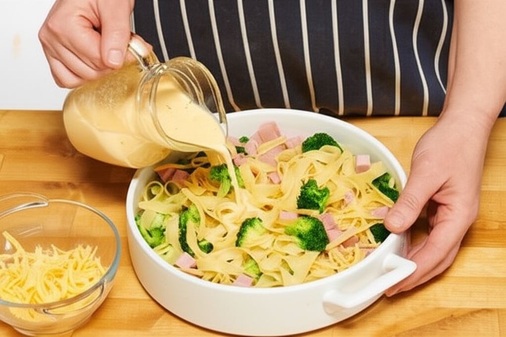 Połącz mleko z Knorr Naturalnie smacznie. Połącz makaron z szynką, serem, brokułem i sosem.