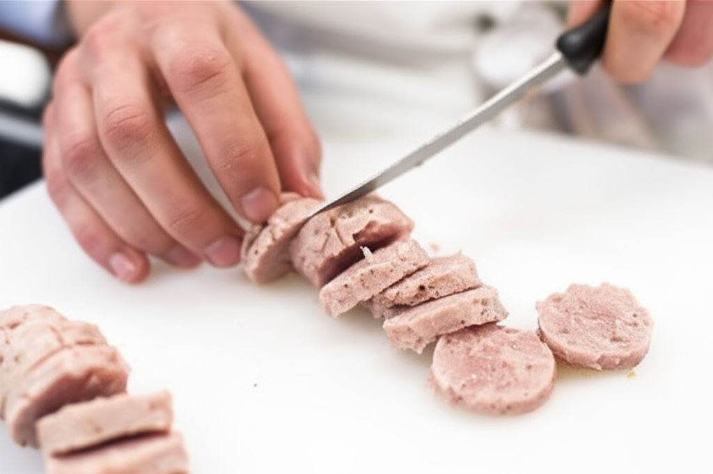 Kiełbasę zdejmij skórkę i pokrój w plasterki. Pieczarki podziel na ćwiartki.