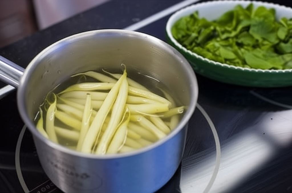 Umieść odmrożony szpinak na spodzie naczynia żaroodpornego. Ugotuj fasolę.