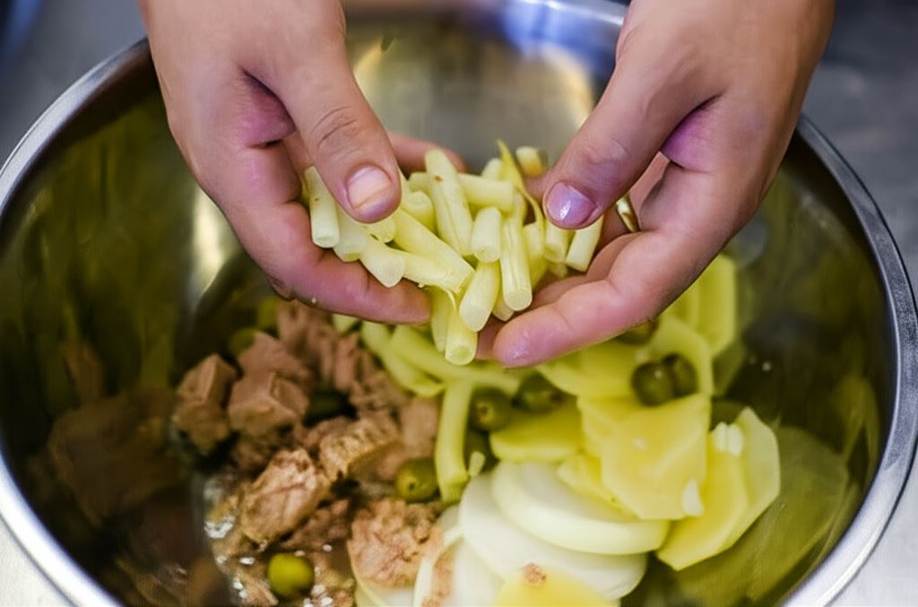 Posiekaj ziemniaki i cebulę na plastry, czosnek przepuść przez praskę. Wymieszaj składniki z tuńczykiem, oliwkami i fasolką.