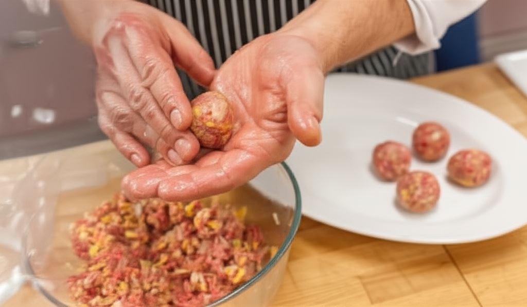 W miseczce wymieszaj mięso mielone, oliwę, połowę startego sera, kumin, kolendrę, posiekane: oliwki, chilli, czosnek oraz cebulę i zagnieć jednolitą masę – przypraw do smaku a potem uformuj małe klopsiki.