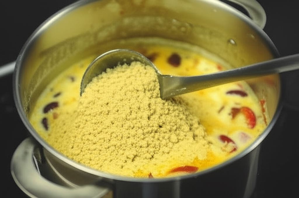 Dodaj śmietanę, 2 szklanki wody, Fix, kmin i połowę natki kolendry. Zagotuj całość, wsyp liście szpinaku i dokładnie wymieszaj.