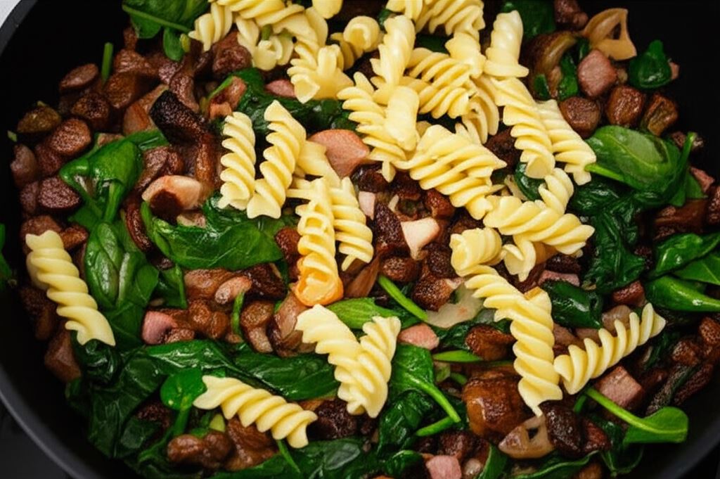 Na rozgrzanym oleju w garnku podsmażaj kiełbasę, odrzuć nadmiar tłuszczu, wsyp cebule i grzyby, smaż wszystko moment aż cebula zeszkli się. Potem dodaj szpinak i suszone pomidory, wymieszaj składniki, wsyp makaron.