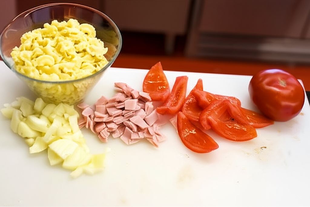Makaron ugotuj al dente. Odcedź, opłucz zimną wodą i osącz. Cebule obierz, posiekaj razem z szynką w kostkę. Pomidory opłucz i pokrój na ćwiartki, wydrąż gniazda nasienne. Jeden pomidor zachowaj do dekoracji.