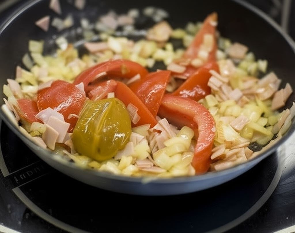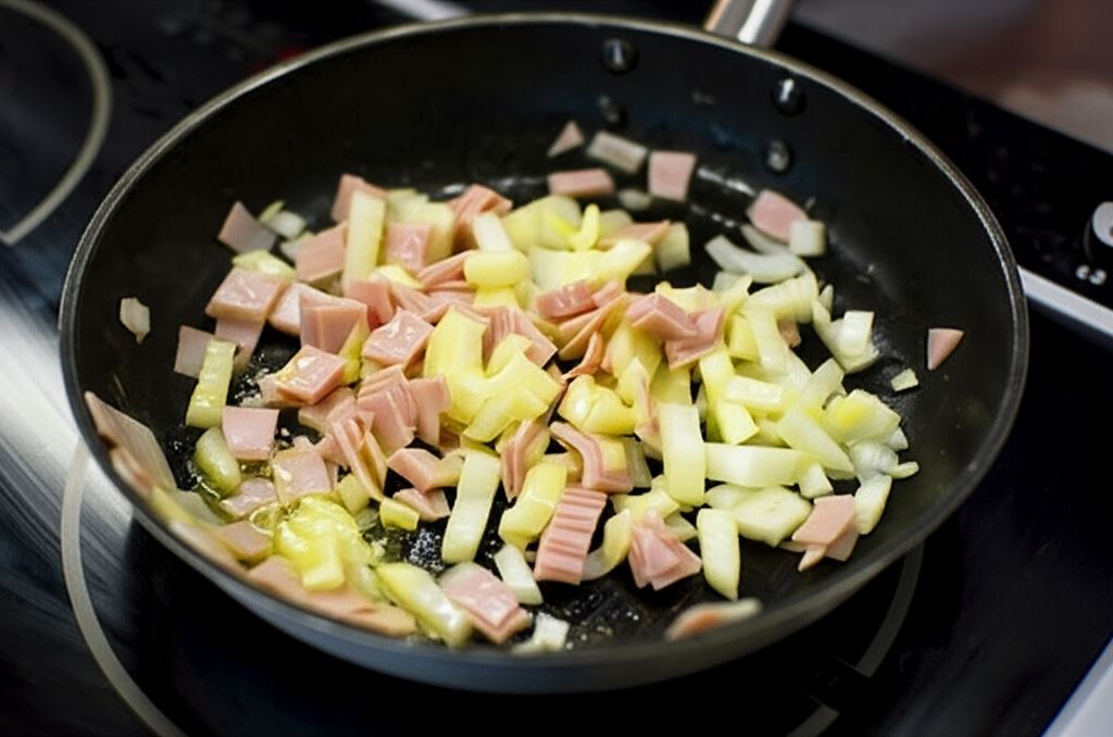 Cebulę zrumień na oleju, dorzuć szynkę.