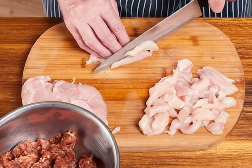 Mięso mielone przypraw przyprawami i wymieszaj, filety potnij w paski, sosy połącz ze śmietaną.