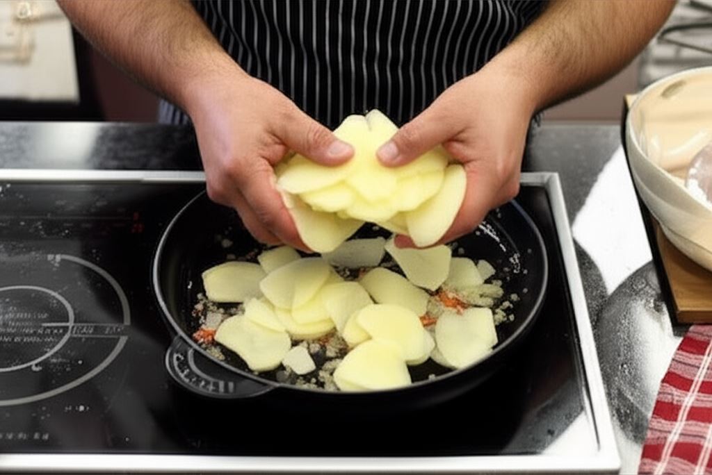 Na rozgrzanej oliwie na patelni zrumień posiekane szalotki, czosnek i chilli. Połowę podsmażonych składników odłóż na talerz, do pozostałej części wsyp ziemniaki. Smaż, nieustannie mieszając, aż skrobia na powierzchni ziemniaków stanie się lśniąca.