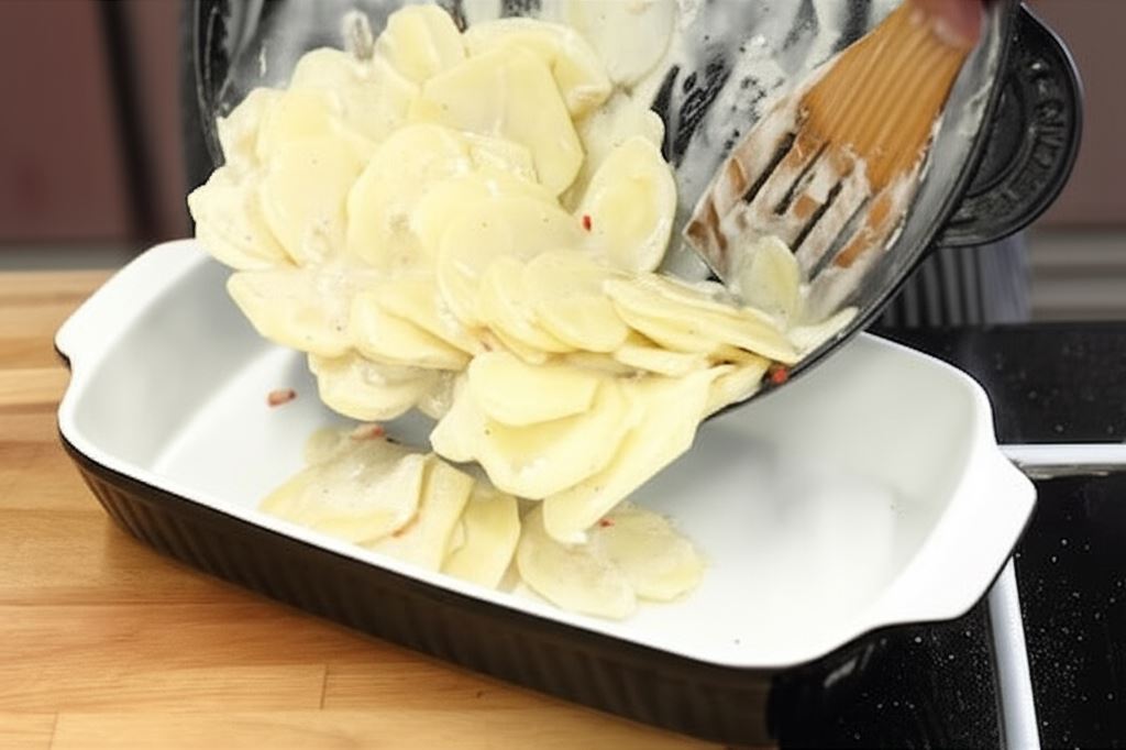 Wlej śmietanę, całość podgrzewaj 1 minutę. Przypraw do smaku gałką oraz odrobiną pieprzu i soli. Ziemniaki umieść na spodzie żaroodpornego naczynia, dociskając starannie.