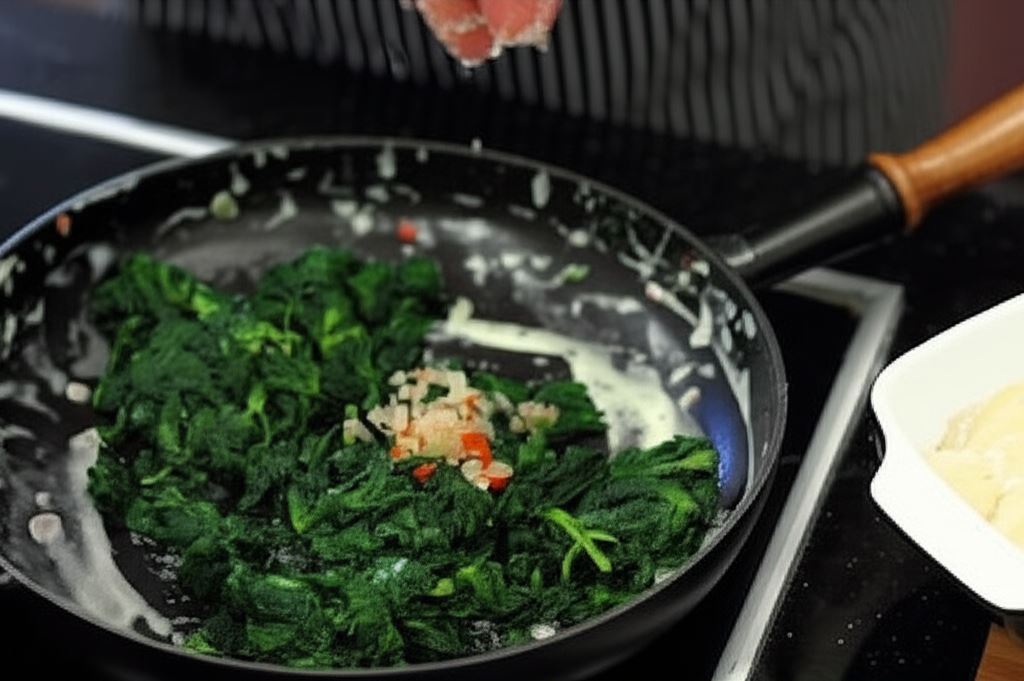 Na tej samej patelni zrumień szpinak, wsyp resztę podsmażonej cebuli. Szpinak również przypraw według gustu. Rozłóż go na ziemniakach.