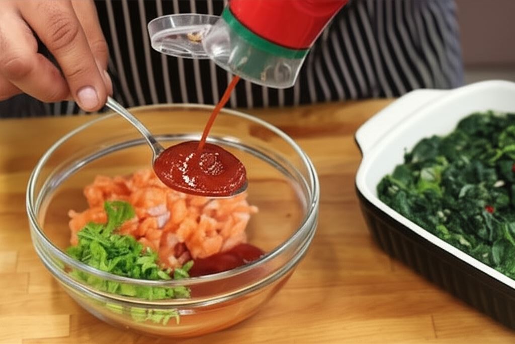Łososia drobno posiekaj i połącz z ketchupem, majonezem oraz posiekaną kolendrą.