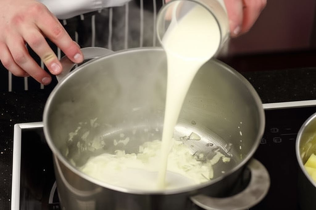 Ziemniaki obierz, pokrój w kostkę 1x1 cm i ugotuj aż będą miękkie. W rondelku zesmaż posiekaną cebulę, dodaj śmietanę. Sos gotuj przez 3 minuty i dopraw według smaku.