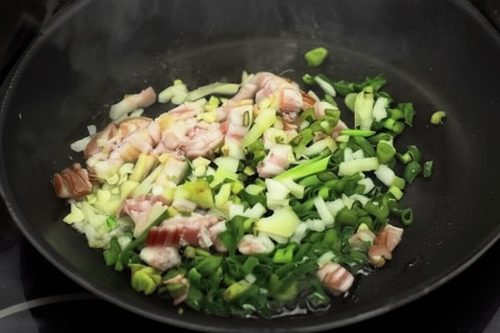 Cebulkę dymkę ze szczypiorem i boczek posiekaj drobno. Przysmaż na osobnej patelni.