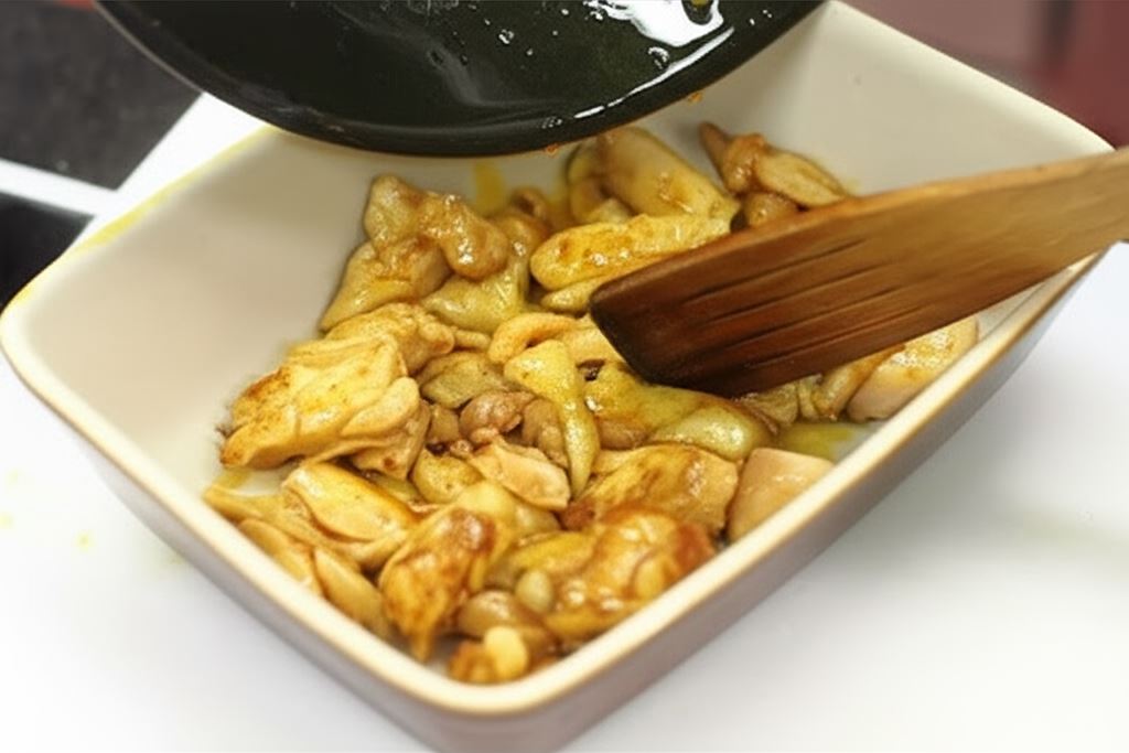 Na spód naczynia żaroodpornego połóż podsmażonego kurczaka.
