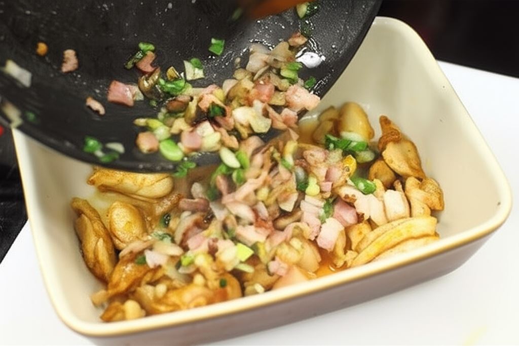 Potem przenieś cebulę z dymką i boczkiem.