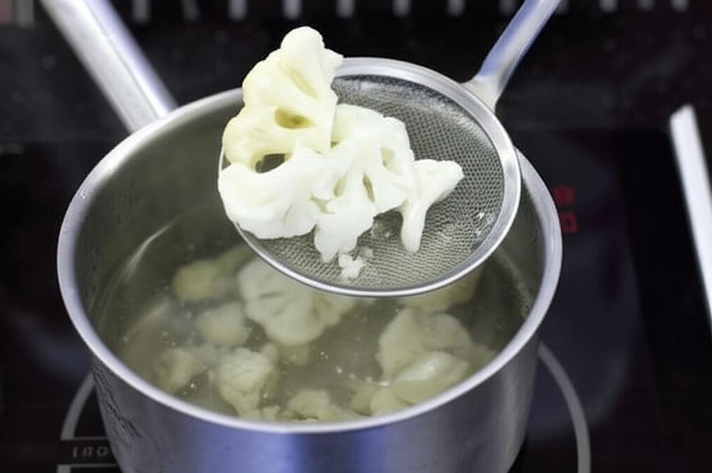 Świeży kalafior podziel na drobniejsze różyczki i gotuj w wodzie aż zmięknie. Kalafior mrożony gotuj od razu po otwarciu opakowania przez 1 minutę.