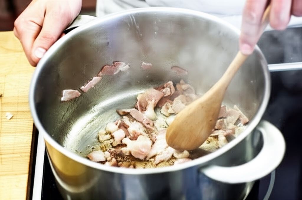 Boczek potnij na cienkie paski i obsmaż w rondlu, aż stanie się bardzo chrupiący. Potem przenieś na talerz.